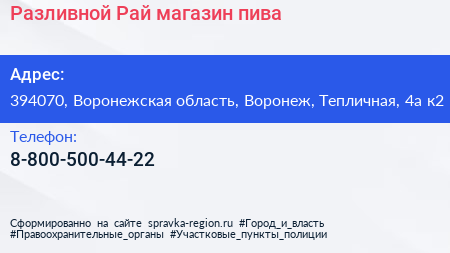 Разливной Рай, магазин пива по адресу 394070, Воронежская область, Воронеж, Тепличная, 4а к2 в дальнейшем Организация, размещена в следующих категориях: