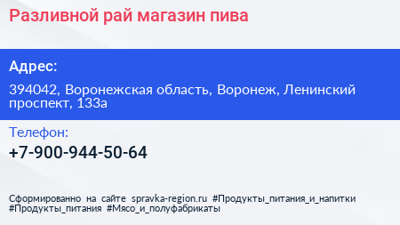 Разливной рай, магазин пива по адресу 394042, Воронежская область, Воронеж, Ленинский проспект, 133а в дальнейшем Организация, размещена в следующих категориях: