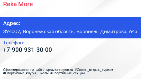 Reka & More по адресу 394007, Воронежская область, Воронеж, Димитрова, 64а в дальнейшем Организация, размещена в следующих категориях: