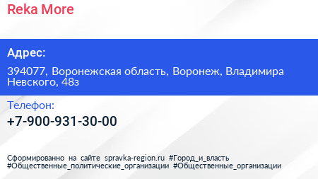 Reka & More по адресу 394077, Воронежская область, Воронеж, Владимира Невского, 48з в дальнейшем Организация, размещена в следующих категориях: