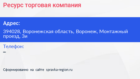 Ресурс, торговая компания по адресу 394028, Воронежская область, Воронеж, Монтажный проезд, 3и в дальнейшем Организация, размещена в следующих категориях: