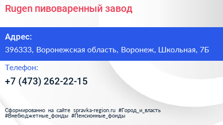 Rugen, пивоваренный завод по адресу 396333, Воронежская область, Воронеж, Школьная, 7Б в дальнейшем Организация, размещена в следующих категориях: