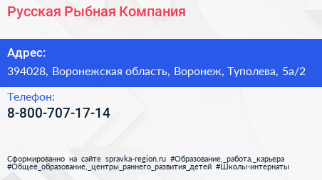 Русская Рыбная Компания по адресу 394028, Воронежская область, Воронеж, Туполева, 5а/2 в дальнейшем Организация, размещена в следующих категориях: