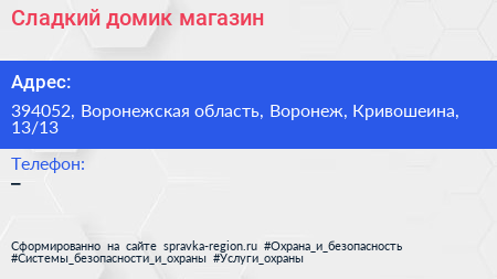 Сладкий домик, магазин по адресу 394052, Воронежская область, Воронеж, Кривошеина, 13/13 в дальнейшем Организация, размещена в следующих категориях: