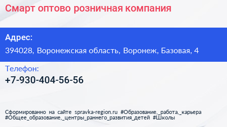 Смарт, оптово-розничная компания по адресу 394028, Воронежская область, Воронеж, Базовая, 4 в дальнейшем Организация, размещена в следующих категориях: