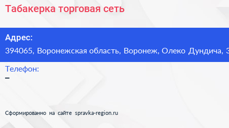 Табакерка, торговая сеть по адресу 394065, Воронежская область, Воронеж, Олеко Дундича, 3 в дальнейшем Организация, размещена в следующих категориях: