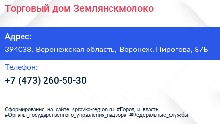 Торговый дом Землянскмолоко по адресу 394038, Воронежская область, Воронеж, Пирогова, 87Б в дальнейшем Организация, размещена в следующих категориях: