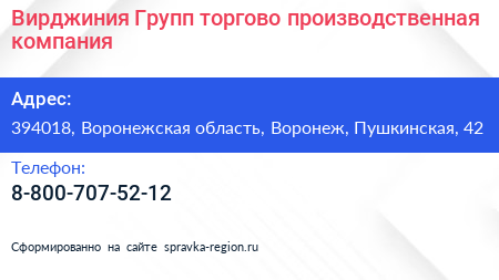 Вирджиния Групп, торгово-производственная компания по адресу 394018, Воронежская область, Воронеж, Пушкинская, 42 в дальнейшем Организация, размещена в следующих категориях: