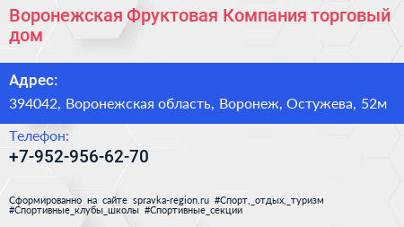 Воронежская Фруктовая Компания, торговый дом по адресу 394042, Воронежская область, Воронеж, Остужева, 52м в дальнейшем Организация, размещена в следующих категориях:
