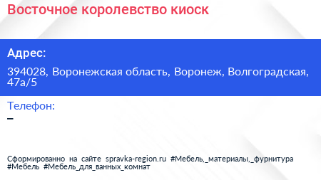 Восточное королевство, киоск по адресу 394028, Воронежская область, Воронеж, Волгоградская, 47а/5 в дальнейшем Организация, размещена в следующих категориях: