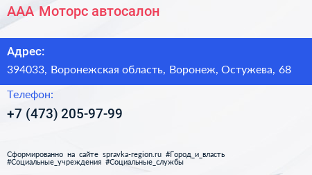 ААА Моторс, автосалон по адресу 394033, Воронежская область, Воронеж, Остужева, 68 в дальнейшем Организация, размещена в следующих категориях: