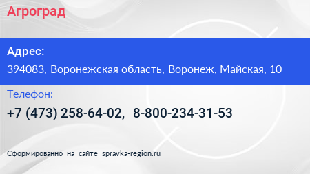 Агроград по адресу 394083, Воронежская область, Воронеж, Майская, 10 в дальнейшем Организация, размещена в следующих категориях: