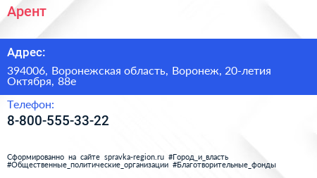 Арент по адресу 394006, Воронежская область, Воронеж, 20-летия Октября, 88е в дальнейшем Организация, размещена в следующих категориях: