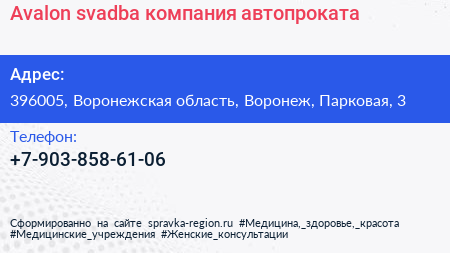 Avalon-svadba, компания автопроката по адресу 396005, Воронежская область, Воронеж, Парковая, 3 в дальнейшем Организация, размещена в следующих категориях: