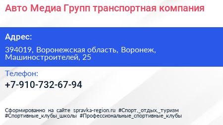Авто-Медиа Групп, транспортная компания по адресу 394019, Воронежская область, Воронеж, Машиностроителей, 25 в дальнейшем Организация, размещена в следующих категориях:
