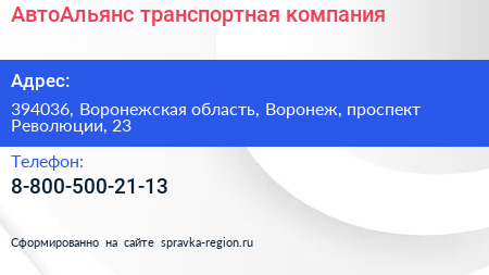 АвтоАльянс, транспортная компания по адресу 394036, Воронежская область, Воронеж, проспект Революции, 23 в дальнейшем Организация, размещена в следующих категориях: