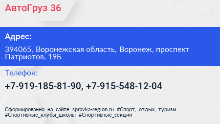 АвтоГруз-36 по адресу 394065, Воронежская область, Воронеж, проспект Патриотов, 19Б в дальнейшем Организация, размещена в следующих категориях: