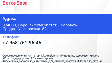 БетонБаза по адресу 394030, Воронежская область, Воронеж, Средне-Московская, 62а в дальнейшем Организация, размещена в следующих категориях: