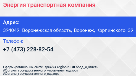 Энергия, транспортная компания по адресу 394049, Воронежская область, Воронеж, Карпинского, 39 в дальнейшем Организация, размещена в следующих категориях: