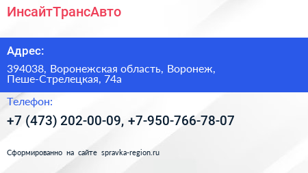 ИнсайтТрансАвто по адресу 394038, Воронежская область, Воронеж, Пеше-Стрелецкая, 74а в дальнейшем Организация, размещена в следующих категориях: