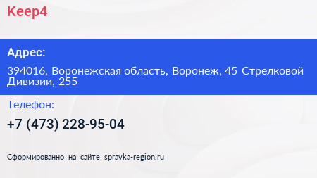 Keep4 по адресу 394016, Воронежская область, Воронеж, 45 Стрелковой Дивизии, 255 в дальнейшем Организация, размещена в следующих категориях: