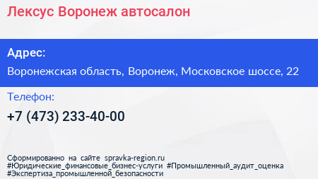 Лексус-Воронеж, автосалон по адресу Воронежская область, Воронеж, Московское шоссе, 22 в дальнейшем Организация, размещена в следующих категориях: