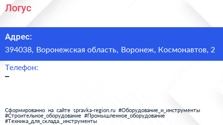 Логус по адресу 394038, Воронежская область, Воронеж, Космонавтов, 2 в дальнейшем Организация, размещена в следующих категориях: