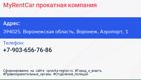 MyRentCar, прокатная компания по адресу 394025, Воронежская область, Воронеж, Аэропорт, 1 в дальнейшем Организация, размещена в следующих категориях: