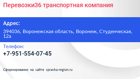 Перевозки36, транспортная компания по адресу 394036, Воронежская область, Воронеж, Студенческая, 12а в дальнейшем Организация, размещена в следующих категориях: