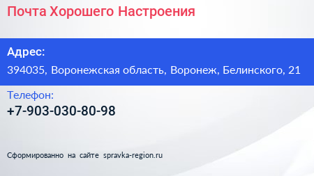 Почта Хорошего Настроения по адресу 394035, Воронежская область, Воронеж, Белинского, 21 в дальнейшем Организация, размещена в следующих категориях: