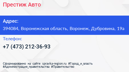Престиж Авто по адресу 394084, Воронежская область, Воронеж, Дубровина, 19а в дальнейшем Организация, размещена в следующих категориях: