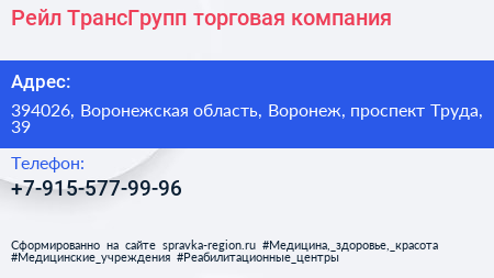 Рейл ТрансГрупп, торговая компания по адресу 394026, Воронежская область, Воронеж, проспект Труда, 39 в дальнейшем Организация, размещена в следующих категориях: