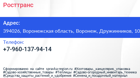 Росттранс по адресу 394026, Воронежская область, Воронеж, Дружинников, 10 в дальнейшем Организация, размещена в следующих категориях: