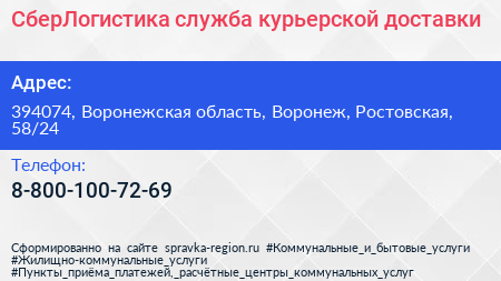 СберЛогистика, служба курьерской доставки по адресу 394074, Воронежская область, Воронеж, Ростовская, 58/24 в дальнейшем Организация, размещена в следующих категориях: