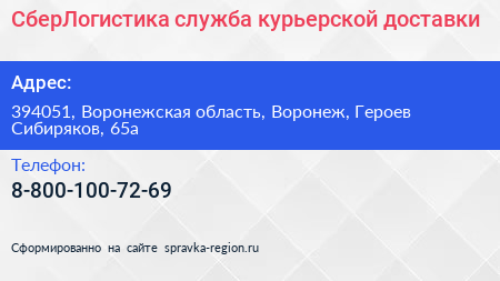СберЛогистика, служба курьерской доставки по адресу 394051, Воронежская область, Воронеж, Героев Сибиряков, 65а в дальнейшем Организация, размещена в следующих категориях: