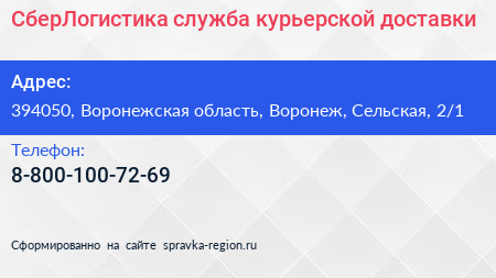 СберЛогистика, служба курьерской доставки по адресу 394050, Воронежская область, Воронеж, Сельская, 2/1 в дальнейшем Организация, размещена в следующих категориях: