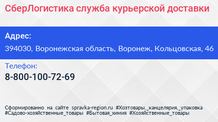 СберЛогистика, служба курьерской доставки по адресу 394030, Воронежская область, Воронеж, Кольцовская, 46 в дальнейшем Организация, размещена в следующих категориях: