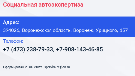 Социальная автоэкспертиза по адресу 394026, Воронежская область, Воронеж, Урицкого, 157 в дальнейшем Организация, размещена в следующих категориях: