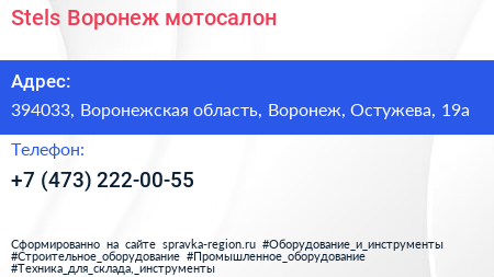 Stels-Воронеж, мотосалон по адресу 394033, Воронежская область, Воронеж, Остужева, 19а в дальнейшем Организация, размещена в следующих категориях: