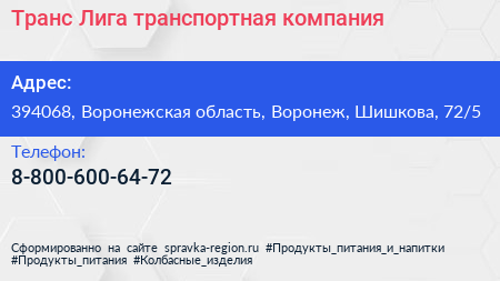 Транс-Лига, транспортная компания по адресу 394068, Воронежская область, Воронеж, Шишкова, 72/5 в дальнейшем Организация, размещена в следующих категориях: