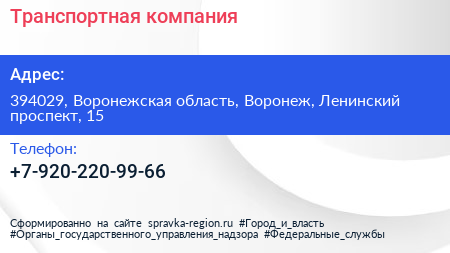 Транспортная компания по адресу 394029, Воронежская область, Воронеж, Ленинский проспект, 15 в дальнейшем Организация, размещена в следующих категориях: