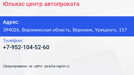 Юлькас, центр автопроката по адресу 394026, Воронежская область, Воронеж, Урицкого, 157 в дальнейшем Организация, размещена в следующих категориях: