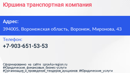 Юршина, транспортная компания по адресу 394005, Воронежская область, Воронеж, Миронова, 43 в дальнейшем Организация, размещена в следующих категориях: