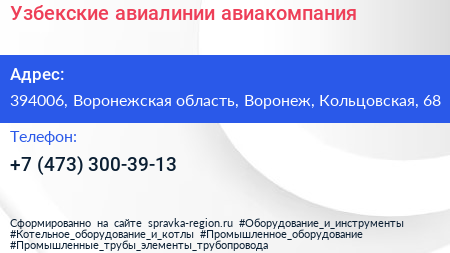 Узбекские авиалинии, авиакомпания по адресу 394006, Воронежская область, Воронеж, Кольцовская, 68 в дальнейшем Организация, размещена в следующих категориях: