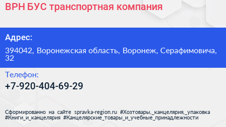 ВРН-БУС, транспортная компания по адресу 394042, Воронежская область, Воронеж, Серафимовича, 32 в дальнейшем Организация, размещена в следующих категориях: