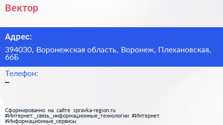 Вектор по адресу 394030, Воронежская область, Воронеж, Плехановская, 66Б в дальнейшем Организация, размещена в следующих категориях: