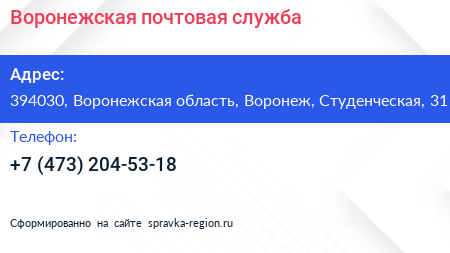 Воронежская почтовая служба по адресу 394030, Воронежская область, Воронеж, Студенческая, 31 в дальнейшем Организация, размещена в следующих категориях:
