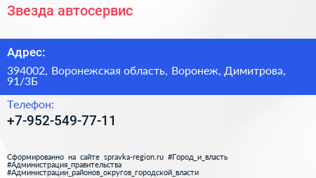 Звезда, автосервис по адресу 394002, Воронежская область, Воронеж, Димитрова, 91/3Б в дальнейшем Организация, размещена в следующих категориях:
