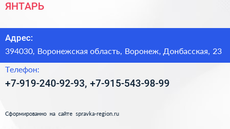 ЯНТАРЬ по адресу 394030, Воронежская область, Воронеж, Донбасская, 23 в дальнейшем Организация, размещена в следующих категориях: