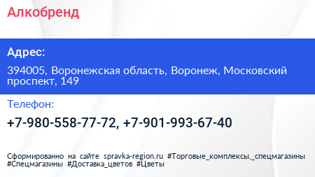 Алкобренд по адресу 394005, Воронежская область, Воронеж, Московский проспект, 149 в дальнейшем Организация, размещена в следующих категориях: